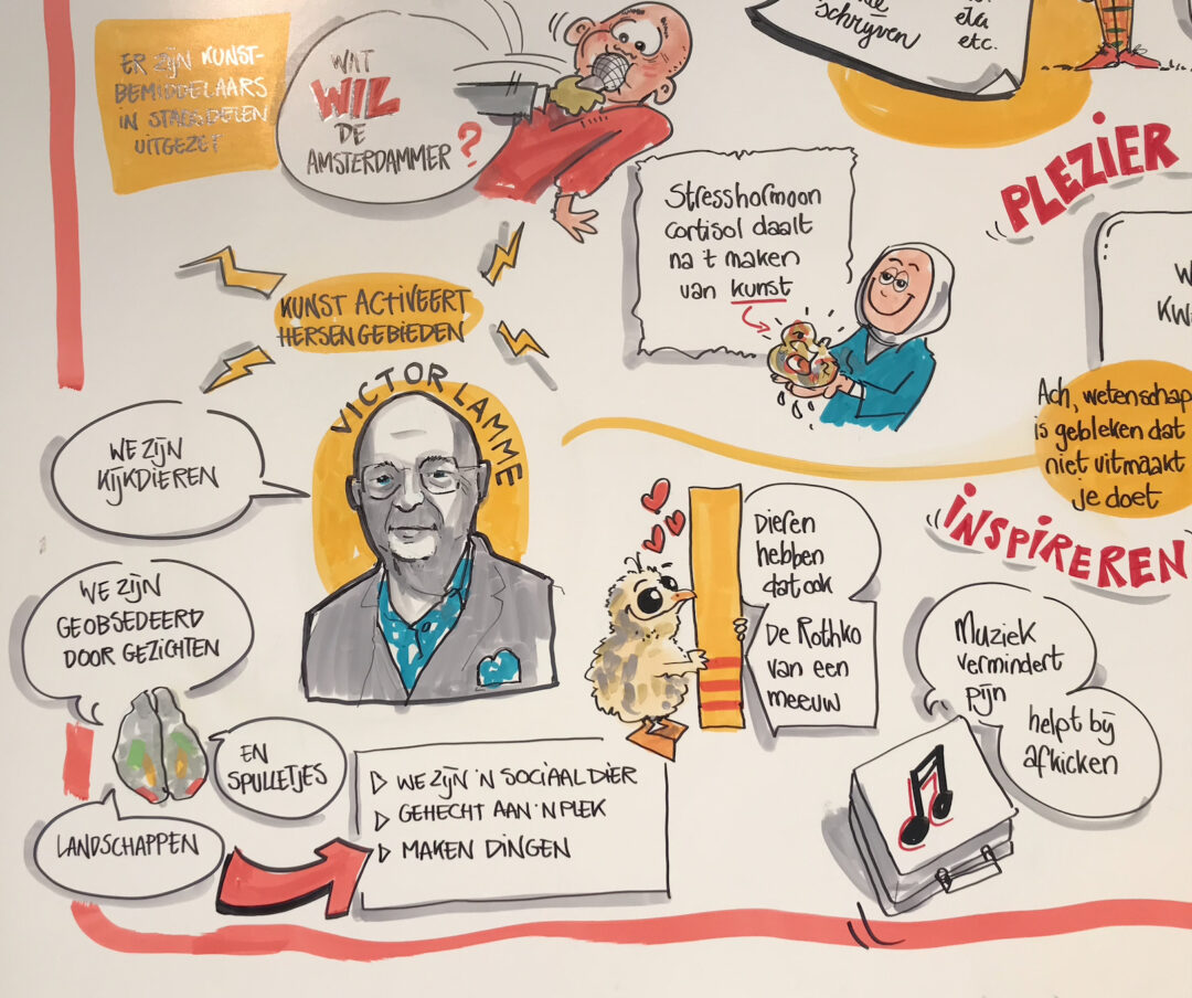 Het begon met voorzichtig tappende voeten en eindigde met een voltallig koor dat in canon het ritme van het leven bezong. De inspiratiemiddag de Kracht van kunst en cultuur maakte een onmiskenbare levenslust los. “Een schilderij of muziek inspireert én maakt mensen aantoonbaar gelukkiger,” beaamt Victor Lamme, hersenonderzoeker.